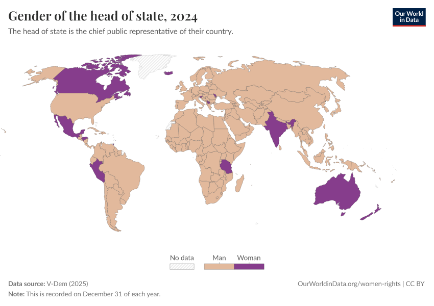 V-Dem (2025) – processed by Our World in Data. “Gender of the head of state” [dataset]. V-Dem, “Democracy report v15” [original data]. Retrieved February 25, 2026 from https://style-labor-employmentrate-c.owid.pages.dev:8789/20260119-070102/grapher/gender-of-the-head-of-state.html (archived on January 19, 2026).