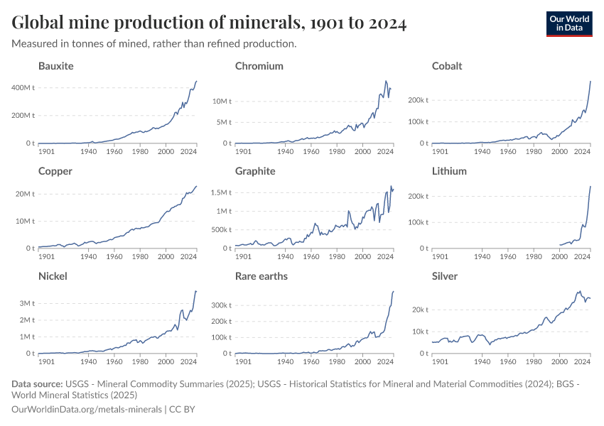 USGS - Mineral Commodity Summaries (2025); USGS - Historical Statistics for Mineral and Material Commodities (2024); BGS - World Mineral Statistics (2025) – with major processing by Our World in Data. “Global mine production of minerals” [dataset]. United States Geological Survey, “Mineral Commodity Summaries”; United States Geological Survey, “Historical Statistics for Mineral and Material Commodities”; British Geological Survey, “World Mineral Statistics” [original data]. Retrieved February 25, 2026 from https://style-labor-employmentrate-c.owid.pages.dev:8789/20260116-170644/grapher/global-mine-production-minerals.html (archived on January 16, 2026).