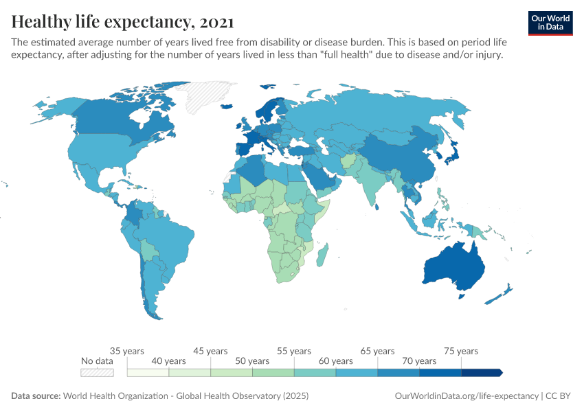 “Data Page: Healthy life expectancy”. Our World in Data (2026). Data adapted from World Health Organization. Retrieved from https://style-labor-employmentrate-c.owid.pages.dev:8789/20260119-070102/grapher/healthy-life-expectancy-at-birth.html [online resource] (archived on January 19, 2026).How to cite this data