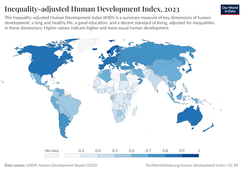 UNDP, Human Development Report (2025) – with minor processing by Our World in Data. “Inequality-adjusted Human Development Index – UNDP” [dataset]. UNDP, Human Development Report, “Human Development Report” [original data]. Retrieved February 25, 2026 from https://style-labor-employmentrate-c.owid.pages.dev:8789/20260119-065148/grapher/inequality-adjusted-human-development-index.html (archived on January 19, 2026).