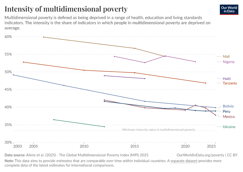 Alkire et al. (2025) - The Global Multidimensional Poverty Index (MPI) 2025 – with minor processing by Our World in Data. “Intensity of multidimensional poverty – Harmonized over time” [dataset]. Alkire et al., “Global Multidimensional Poverty Index (MPI) 2025” [original data]. Retrieved February 25, 2026 from https://style-labor-employmentrate-c.owid.pages.dev:8789/20251229-175603/grapher/intensity-of-multidimensional-poverty-hot.html (archived on December 29, 2025).
