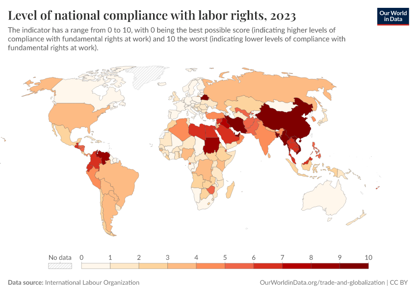 “Data Page: Level of national compliance with labor rights”. Our World in Data (2026). Data adapted from International Labour Organization. Retrieved from https://style-labor-employmentrate-c.owid.pages.dev:8789/20260130-180113/grapher/level-of-national-compliance-with-labor-rights.html [online resource] (archived on January 30, 2026).How to cite this data