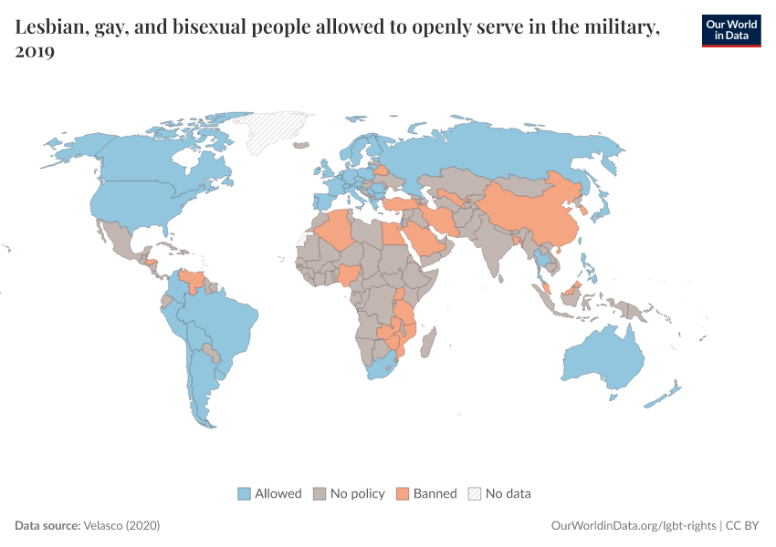 “Data Page: Lesbian, gay, and bisexual people allowed to openly serve in the military”, part of the following publication: Bastian Herre and Pablo Arriagada (2023) - “LGBT+ Rights”. Data adapted from Velasco. Retrieved from https://style-labor-employmentrate-c.owid.pages.dev:8789/20251023-195030/grapher/lgb-military-velasco.html [online resource] (archived on October 23, 2025).How to cite this data