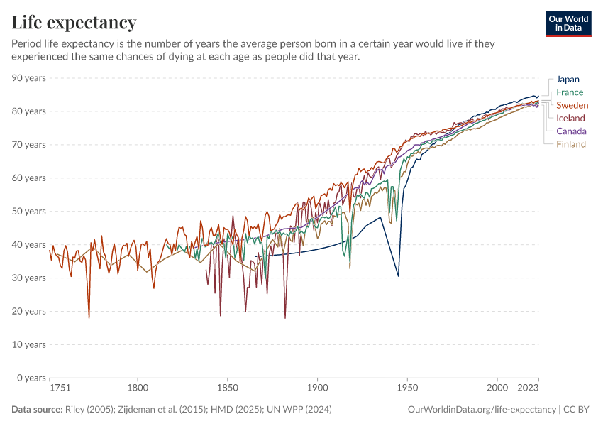 “Data Page: Life expectancy”, part of the following publication: Saloni Dattani, Lucas Rodés-Guirao, Hannah Ritchie, Esteban Ortiz-Ospina, and Max Roser (2023) - “Life Expectancy”. Data adapted from Human Mortality Database, United Nations, Zijdeman et al., James C. Riley. Retrieved from https://style-labor-employmentrate-c.owid.pages.dev:8789/20260225-014904/grapher/life-expectancy.html [online resource] (archived on February 25, 2026).