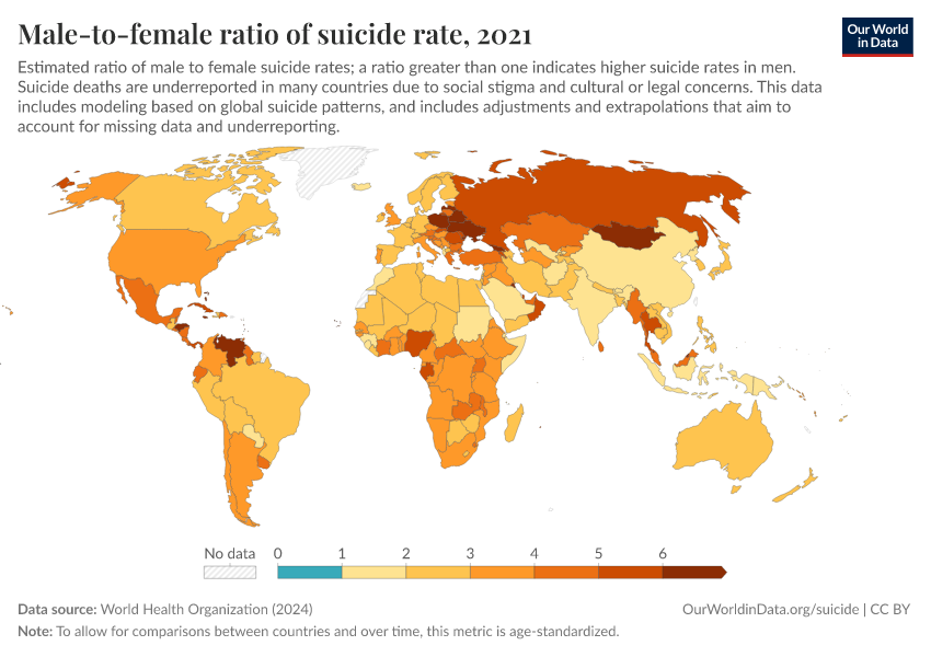 World Health Organization (2024) – with major processing by Our World in Data. “Male-to-female ratio of suicide rate” [dataset]. World Health Organization, “Global Health Estimates” [original data]. Retrieved February 25, 2026 from https://style-labor-employmentrate-c.owid.pages.dev:8789/20250909-093708/grapher/male-female-ratio-suicides-rates.html (archived on September 9, 2025).
