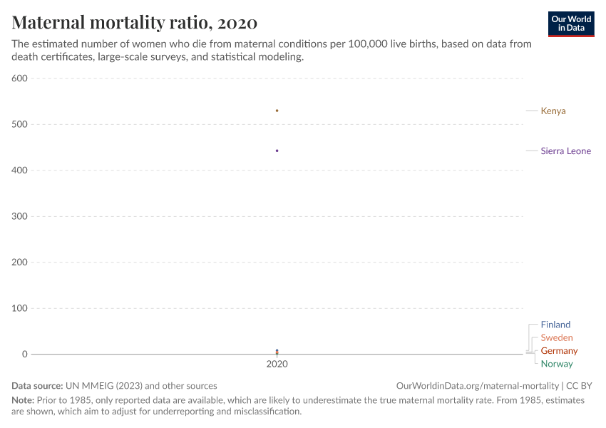 “Data Page: Maternal mortality ratio”, part of the following publication: Max Roser and Hannah Ritchie (2013) - “Maternal Mortality”. Data adapted from UN MMEIG (WHO, UNICEF, UNFPA, World Bank Group and UNDESA/ Population Division), WHO Mortality Database, United Nations, Gapminder. Retrieved from https://style-labor-employmentrate-c.owid.pages.dev:8789/20260119-065148/grapher/maternal-mortality.html [online resource] (archived on January 19, 2026).How to cite this data