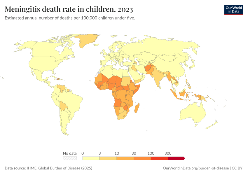 “Data Page: Meningitis death rate in children”, part of the following publication: Esteban Ortiz-Ospina and Max Roser (2016) - “Global Health”. Data adapted from IHME, Global Burden of Disease. Retrieved from https://style-labor-employmentrate-c.owid.pages.dev:8789/20260211-174736/grapher/meningitis-death-rates-children-under-5.html [online resource] (archived on February 11, 2026).How to cite this data