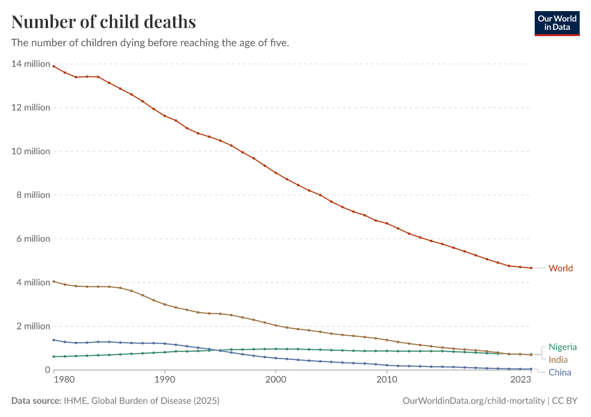 IHME, Global Burden of Disease (2025) – with major processing by Our World in Data. “Number of child deaths” [dataset]. IHME, Global Burden of Disease, “Global Burden of Disease - Deaths” [original data]. Retrieved February 25, 2026 from https://style-labor-employmentrate-c.owid.pages.dev:8789/20260211-174736/grapher/number-of-child-deaths.html (archived on February 11, 2026).