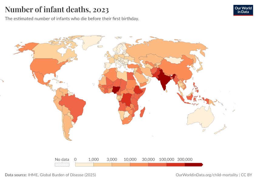 IHME, Global Burden of Disease (2025) – with minor processing by Our World in Data. “Number of infant deaths” [dataset]. IHME, Global Burden of Disease, “Global Burden of Disease - Child Mortality” [original data]. Retrieved February 25, 2026 from https://style-labor-employmentrate-c.owid.pages.dev:8789/20260213-140117/grapher/number-of-infant-deaths-ihme.html (archived on February 13, 2026).