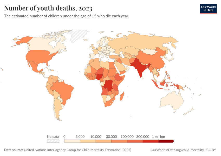 “Data Page: Under-fifteen deaths”, part of the following publication: Saloni Dattani, Fiona Spooner, Hannah Ritchie, and Max Roser (2023) - “Child and Infant Mortality”. Data adapted from United Nations Inter-agency Group for Child Mortality Estimation, UN Inter-agency Group for Child Mortality Estimation, Various sources. Retrieved from https://style-labor-employmentrate-c.owid.pages.dev:8789/20260223-071105/grapher/number-of-youth-deaths.html [online resource] (archived on February 23, 2026).