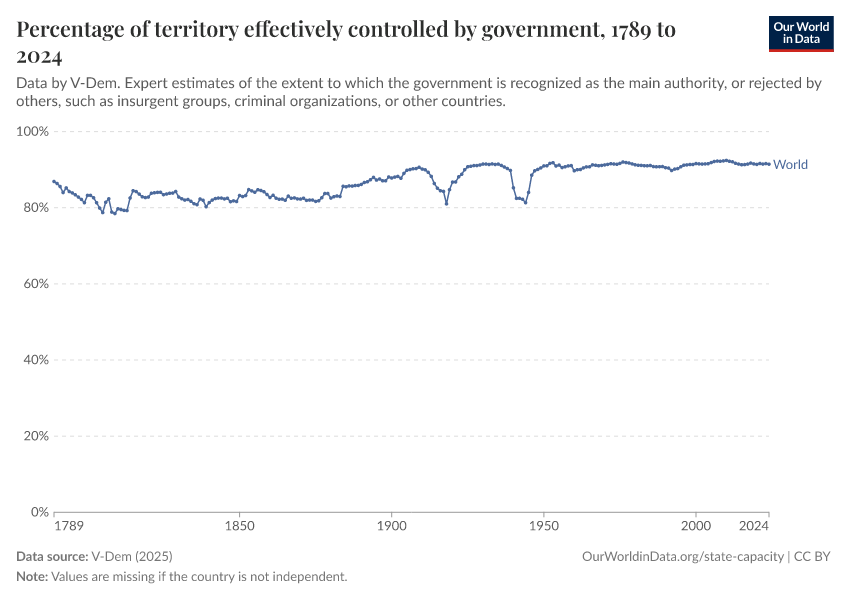 “Data Page: Territory under state control”, part of the following publication: Bastian Herre, Lucas Rodés-Guirao, and Esteban Ortiz-Ospina (2013) - “Democracy”. Data adapted from V-Dem. Retrieved from https://style-labor-employmentrate-c.owid.pages.dev:8789/20260119-070102/grapher/percentage-of-territory-controlled-by-government.html [online resource] (archived on January 19, 2026).How to cite this data