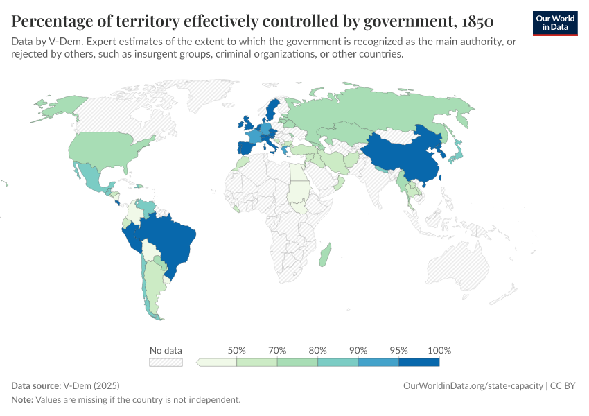 “Data Page: Territory under state control”, part of the following publication: Bastian Herre, Lucas Rodés-Guirao, and Esteban Ortiz-Ospina (2013) - “Democracy”. Data adapted from V-Dem. Retrieved from https://style-labor-employmentrate-c.owid.pages.dev:8789/20260119-070102/grapher/percentage-of-territory-controlled-by-government.html [online resource] (archived on January 19, 2026).How to cite this data