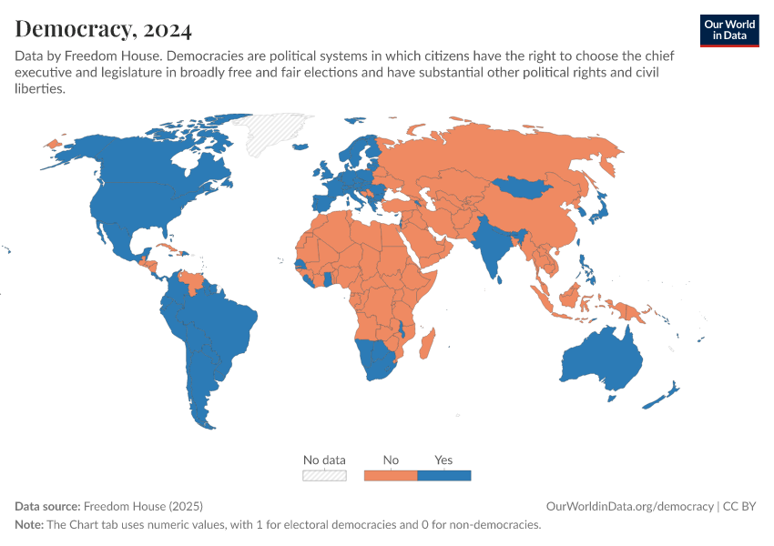 Freedom House (2025) – processed by Our World in Data. “Democracy” [dataset]. Freedom House, “Freedom in the World” [original data]. Retrieved February 25, 2026 from https://style-labor-employmentrate-c.owid.pages.dev:8789/20260119-070102/grapher/political-regime-dem-fh.html (archived on January 19, 2026).