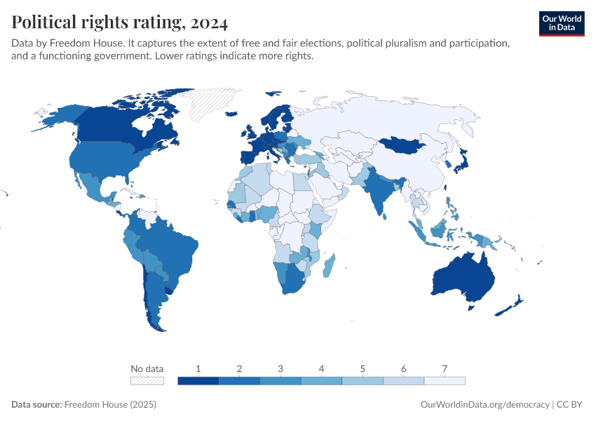 Freedom House (2025) – processed by Our World in Data. “Political rights rating” [dataset]. Freedom House, “Freedom in the World” [original data]. Retrieved February 25, 2026 from https://style-labor-employmentrate-c.owid.pages.dev:8789/20260119-070102/grapher/political-rights-rating-fh.html (archived on January 19, 2026).