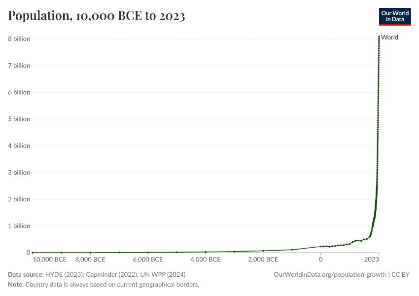 “Data Page: Population”, part of the following publication: Hannah Ritchie, Lucas Rodés-Guirao, Edouard Mathieu, Marcel Gerber, Esteban Ortiz-Ospina, Joe Hasell, and Max Roser (2023) - “Population Growth”. Data adapted from PBL Netherlands Environmental Assessment Agency, Gapminder, United Nations. Retrieved from https://style-labor-employmentrate-c.owid.pages.dev:8789/20260119-065148/grapher/population.html [online resource] (archived on January 19, 2026).How to cite this data