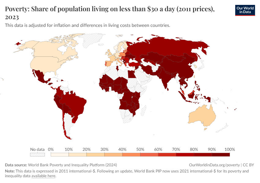 “Data Page: Poverty: Share of population living on less than $30 a day (2011 prices)”, part of the following publication: Joe Hasell, Bertha Rohenkohl, Pablo Arriagada, Esteban Ortiz-Ospina, and Max Roser (2022) - “Poverty”. Data adapted from World Bank Poverty and Inequality Platform. Retrieved from https://style-labor-employmentrate-c.owid.pages.dev:8789/20251022-091218/grapher/poverty-share-on-less-than-30-per-day-2011-ppp.html [online resource] (archived on October 22, 2025).How to cite this data