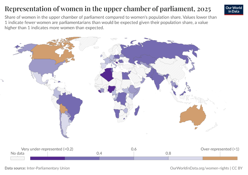 “Data Page: Representation of women in the upper chamber of parliament”. Our World in Data (2026). Data adapted from Inter-Parliamentary Union. Retrieved from https://style-labor-employmentrate-c.owid.pages.dev:8789/20260130-180113/grapher/representation-of-women-in-the-upper-chamber-of-parliament.html [online resource] (archived on January 30, 2026).How to cite this data