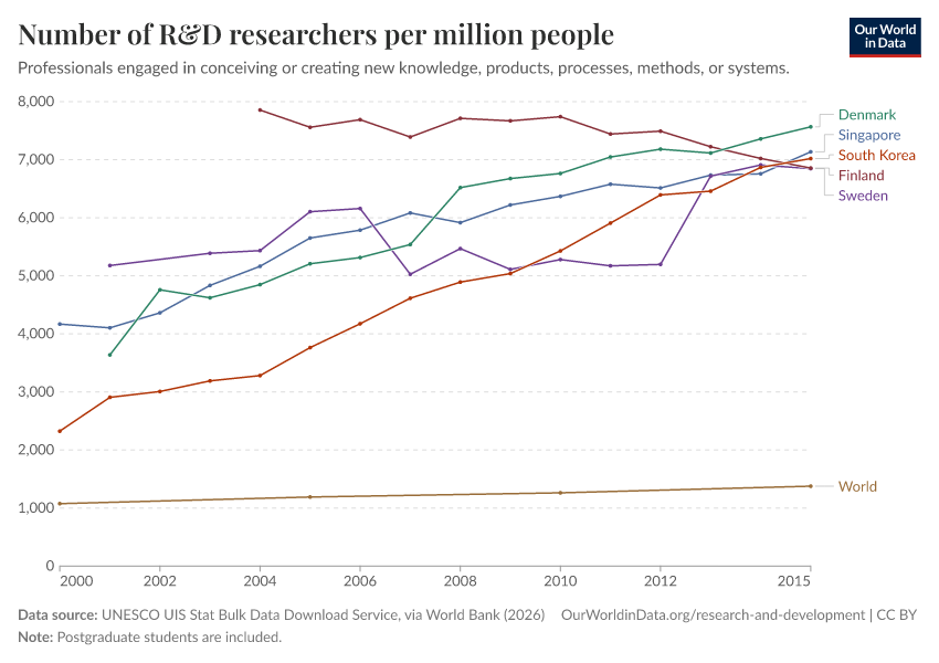 “Data Page: Number of R&D researchers per million people”. Our World in Data (2026). Data adapted from UNESCO UIS Stat Bulk Data Download Service, via World Bank. Retrieved from https://style-labor-employmentrate-c.owid.pages.dev:8789/20260202-181317/grapher/researchers-in-rd-per-million-people.html [online resource] (archived on February 2, 2026).How to cite this data