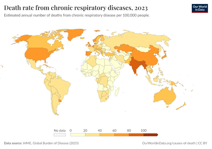 IHME, Global Burden of Disease (2025) – with major processing by Our World in Data. “Death rate from chronic respiratory diseases” [dataset]. IHME, Global Burden of Disease, “Global Burden of Disease - Deaths” [original data]. Retrieved February 25, 2026 from https://style-labor-employmentrate-c.owid.pages.dev:8789/20260211-174736/grapher/respiratory-disease-death-rate-gbd.html (archived on February 11, 2026).