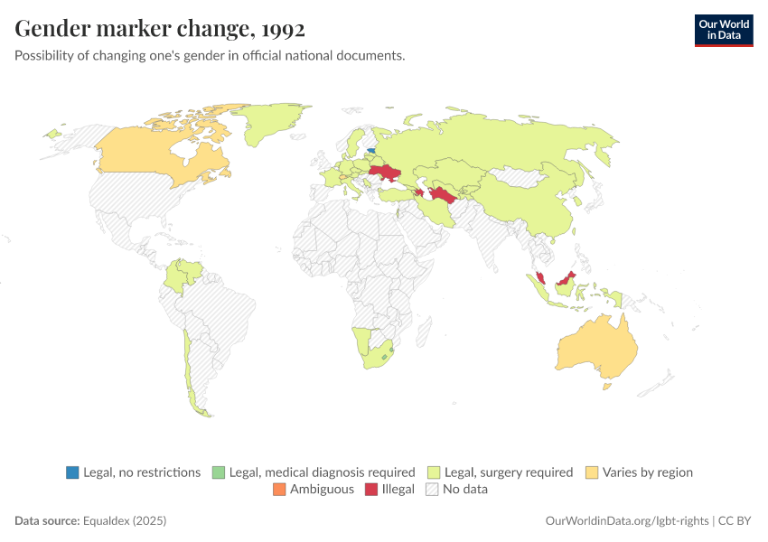 “Data Page: Gender marker change”, part of the following publication: Bastian Herre and Pablo Arriagada (2023) - “LGBT+ Rights”. Data adapted from Equaldex. Retrieved from https://style-labor-employmentrate-c.owid.pages.dev:8789/20250909-093708/grapher/right-to-change-legal-gender-equaldex.html [online resource] (archived on September 9, 2025).How to cite this data