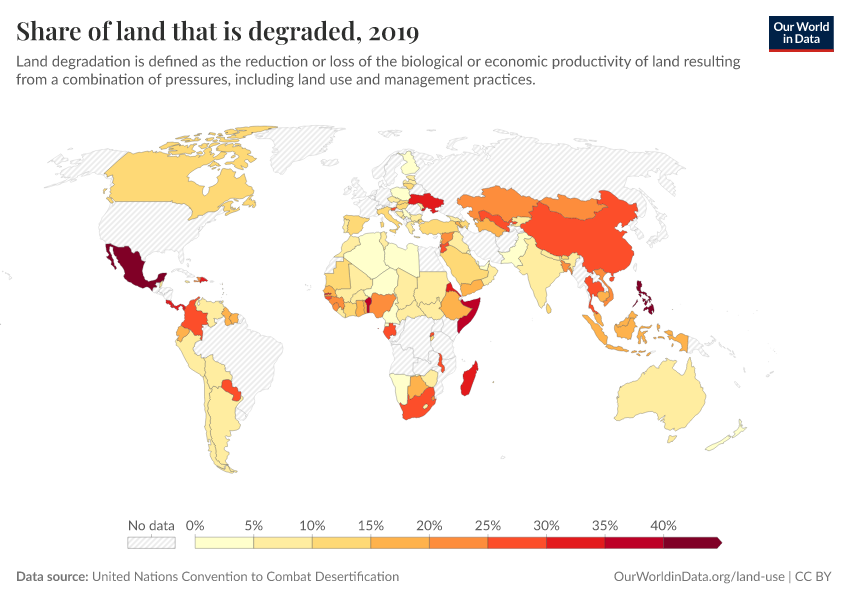 “Data Page: Share of land that is degraded”. Our World in Data (2026). Data adapted from United Nations Convention to Combat Desertification. Retrieved from https://style-labor-employmentrate-c.owid.pages.dev:8789/20260130-180113/grapher/share-degraded-land.html [online resource] (archived on January 30, 2026).How to cite this data