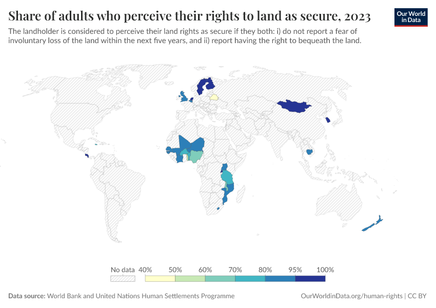 “Data Page: Share of adults who perceive their rights to land as secure”. Our World in Data (2026). Data adapted from World Bank and United Nations Human Settlements Programme. Retrieved from https://style-labor-employmentrate-c.owid.pages.dev:8789/20251121-151713/grapher/share-of-adults-who-perceive-their-rights-to-land-as-secure.html [online resource] (archived on November 21, 2025).How to cite this data