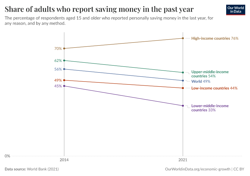 “Data Page: Share of adults who report saving money in the past year”, part of the following publication: Max Roser, Bertha Rohenkohl, Pablo Arriagada, Joe Hasell, Hannah Ritchie, and Esteban Ortiz-Ospina (2023) - “Economic Growth”. Data adapted from World Bank. Retrieved from https://style-labor-employmentrate-c.owid.pages.dev:8789/20250909-093708/grapher/share-of-adults-who-report-saving-money-in-the-past-year.html [online resource] (archived on September 9, 2025).How to cite this data