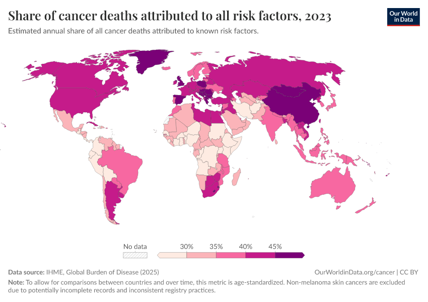 IHME, Global Burden of Disease (2025) – processed by Our World in Data. “Share of cancer deaths attributed to all risk factors” [dataset]. IHME, Global Burden of Disease, “Global Burden of Disease - Risk Factors for Cancer Deaths” [original data]. Retrieved February 25, 2026 from https://style-labor-employmentrate-c.owid.pages.dev:8789/20260213-144351/grapher/share-of-cancer-deaths-attributed-to-all-risk-factors.html (archived on February 13, 2026).