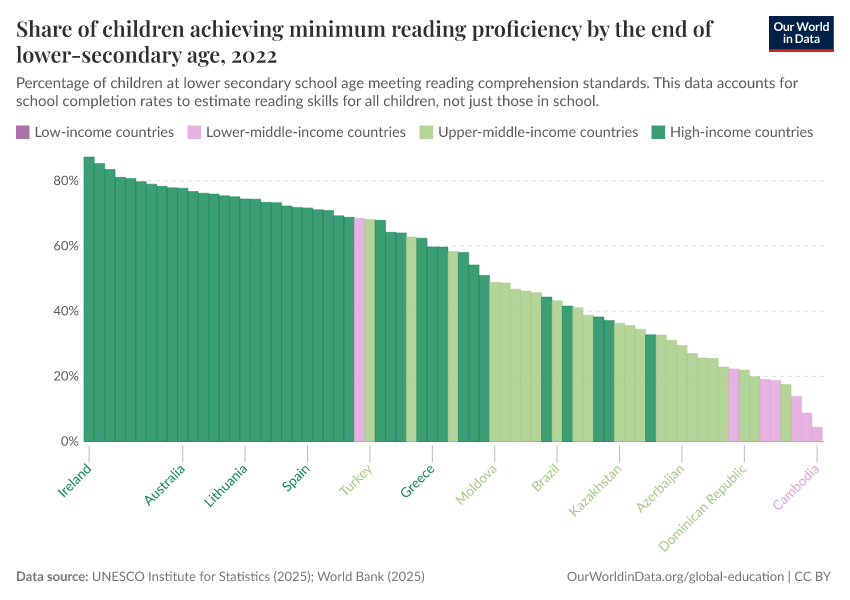 “Data Page: Share of children achieving minimum reading proficiency by the end of lower secondary age”, part of the following publication: Hannah Ritchie, Veronika Samborska, Esteban Ortiz-Ospina, and Max Roser (2023) - “Global Education”. Data adapted from UNESCO Institute for Statistics. Retrieved from https://style-labor-employmentrate-c.owid.pages.dev:8789/20260122-091445/grapher/share-of-children-reaching-sufficient-reading-comprehension-by-the-end-of-lower-secondary-age.html [online resource] (archived on January 22, 2026).How to cite this data