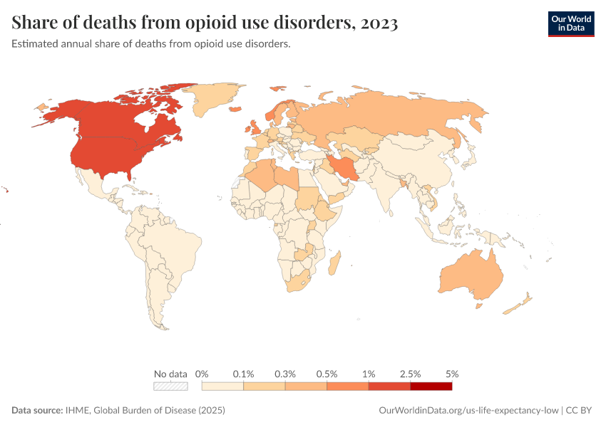 IHME, Global Burden of Disease (2025) – with major processing by Our World in Data. “Share of deaths from opioid use disorders” [dataset]. IHME, Global Burden of Disease, “Global Burden of Disease - Deaths” [original data]. Retrieved February 25, 2026 from https://style-labor-employmentrate-c.owid.pages.dev:8789/20260211-174736/grapher/share-of-deaths-from-opioid-overdoses.html (archived on February 11, 2026).
