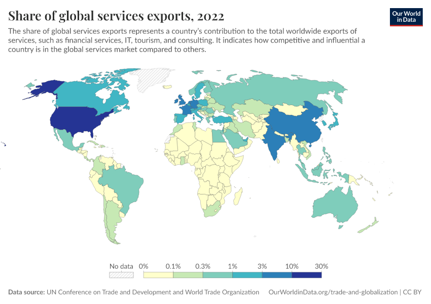 “Data Page: Share of global services exports”. Our World in Data (2026). Data adapted from UN Conference on Trade and Development and World Trade Organization. Retrieved from https://style-labor-employmentrate-c.owid.pages.dev:8789/20260130-180113/grapher/share-of-global-services-exports.html [online resource] (archived on January 30, 2026).How to cite this data