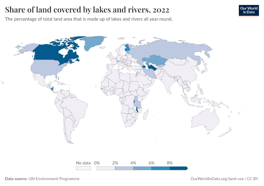 “Data Page: Share of land covered by lakes and rivers”. Our World in Data (2026). Data adapted from UN Environment Programme. Retrieved from https://style-labor-employmentrate-c.owid.pages.dev:8789/20260130-180113/grapher/share-of-land-covered-by-lakes-and-rivers.html [online resource] (archived on January 30, 2026).How to cite this data
