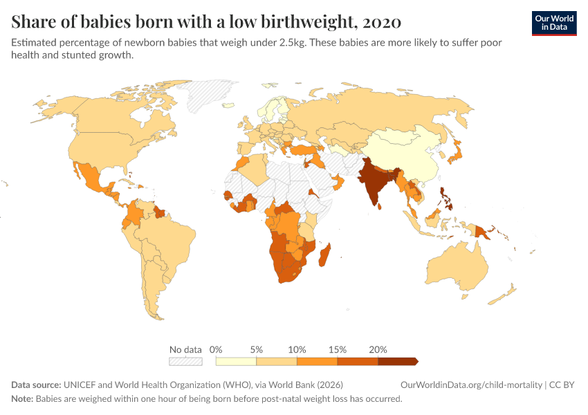 “Data Page: Share of babies born with a low birthweight”. Our World in Data (2026). Data adapted from UNICEF and World Health Organization (WHO), via World Bank. Retrieved from https://style-labor-employmentrate-c.owid.pages.dev:8789/20260202-181317/grapher/share-of-low-birthweight-babies-born.html [online resource] (archived on February 2, 2026).How to cite this data