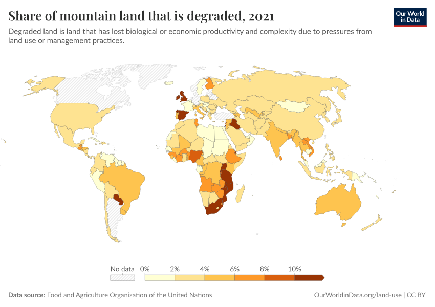 Food and Agriculture Organization of the United Nations – processed by Our World in Data. “Share of mountain land that is degraded” [dataset]. Food and Agriculture Organization of the United Nations, “Food and Agriculture Organization of the United Nations (FAO), South African National Biodiversity Institute (SANBI), Instituto Brasileiro de Geografia e Estatística (IBGE)” [original data]. Retrieved February 25, 2026 from https://style-labor-employmentrate-c.owid.pages.dev:8789/20260130-180113/grapher/share-of-mountain-land-that-is-degraded.html (archived on January 30, 2026).