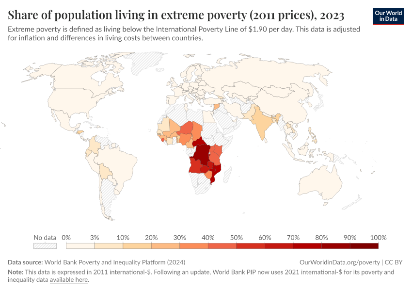 “Data Page: Share of population living in extreme poverty (2011 prices)”, part of the following publication: Joe Hasell, Bertha Rohenkohl, Pablo Arriagada, Esteban Ortiz-Ospina, and Max Roser (2022) - “Poverty”. Data adapted from World Bank Poverty and Inequality Platform. Retrieved from https://style-labor-employmentrate-c.owid.pages.dev:8789/20251022-091218/grapher/share-of-population-in-extreme-poverty-2011-ppp.html [online resource] (archived on October 22, 2025).How to cite this data