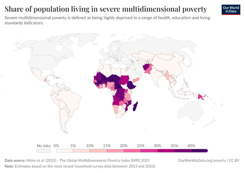 Alkire et al. (2025) - The Global Multidimensional Poverty Index (MPI) 2025 – with minor processing by Our World in Data. “Share of population living in severe multidimensional poverty – Most recent year” [dataset]. Alkire et al., “Global Multidimensional Poverty Index (MPI) 2025” [original data]. Retrieved February 25, 2026 from https://style-labor-employmentrate-c.owid.pages.dev:8789/20251229-175603/grapher/share-of-population-in-severe-multidimensional-poverty.html (archived on December 29, 2025).