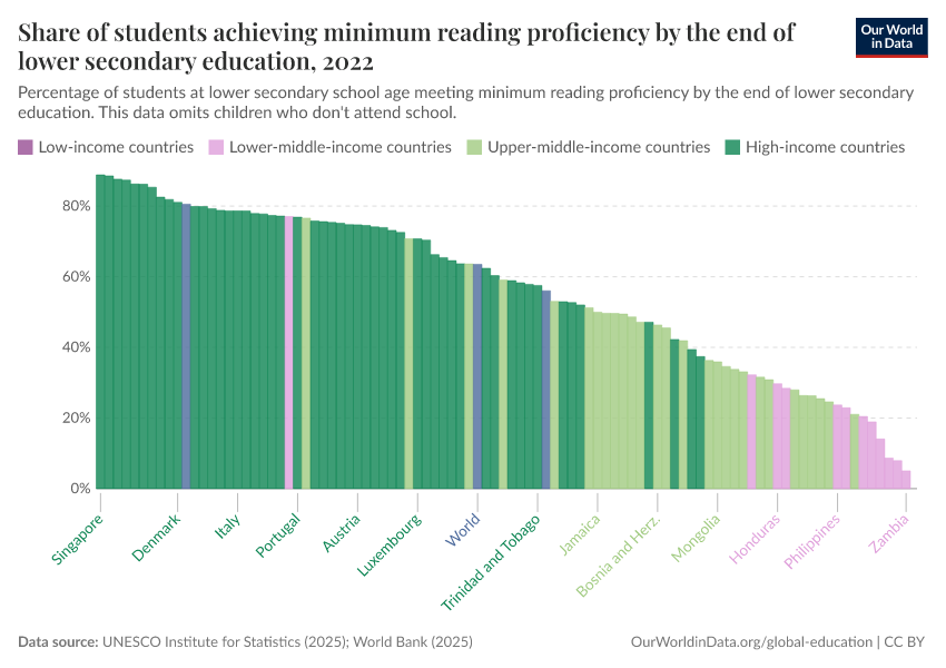 “Data Page: Share of students achieving minimum reading proficiency by the end of lower secondary education”, part of the following publication: Hannah Ritchie, Veronika Samborska, Esteban Ortiz-Ospina, and Max Roser (2023) - “Global Education”. Data adapted from UNESCO Institute for Statistics. Retrieved from https://style-labor-employmentrate-c.owid.pages.dev:8789/20260122-091445/grapher/share-of-students-at-end-of-lower-secondary-education-with-minimum-reading-proficiency.html [online resource] (archived on January 22, 2026).How to cite this data