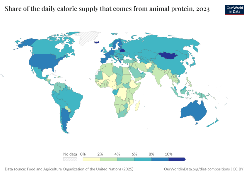 “Data Page: Share of the daily calorie supply that comes from animal protein”, part of the following publication: Hannah Ritchie, Pablo Rosado, and Max Roser (2023) - “Agricultural Production”. Data adapted from Food and Agriculture Organization of the United Nations. Retrieved from https://style-labor-employmentrate-c.owid.pages.dev:8789/20260116-144923/grapher/share-of-the-daily-calorie-supply-that-comes-from-animal-protein.html [online resource] (archived on January 16, 2026).How to cite this data