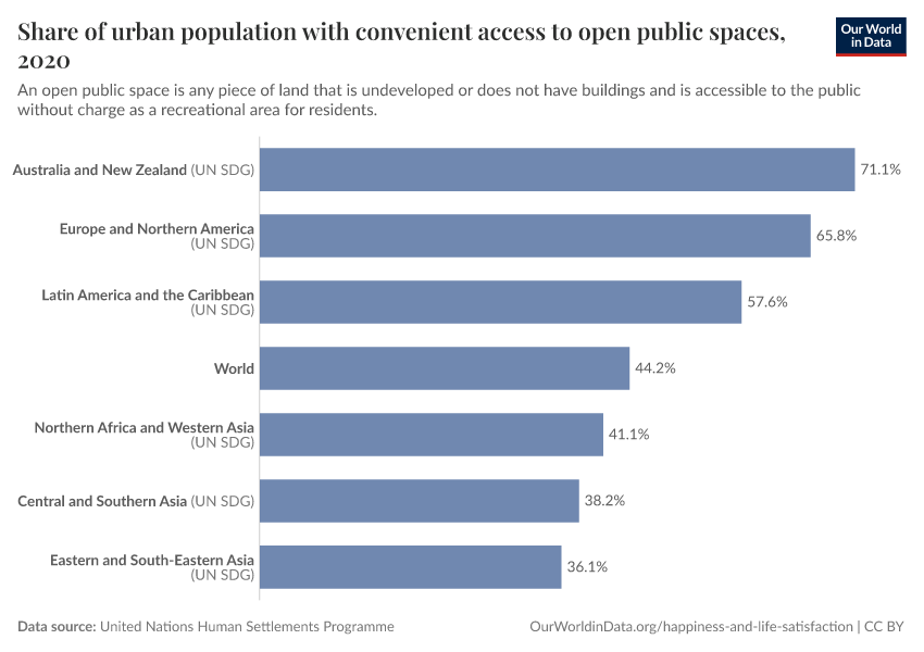 United Nations Human Settlements Programme – processed by Our World in Data. “Share of urban population with convenient access to open public spaces” [dataset]. United Nations Human Settlements Programme, “Data from multiple sources” [original data]. Retrieved February 25, 2026 from https://style-labor-employmentrate-c.owid.pages.dev:8789/20260130-180113/grapher/share-of-urban-population-with-convenient-access-to-open-public-spaces.html (archived on January 30, 2026).