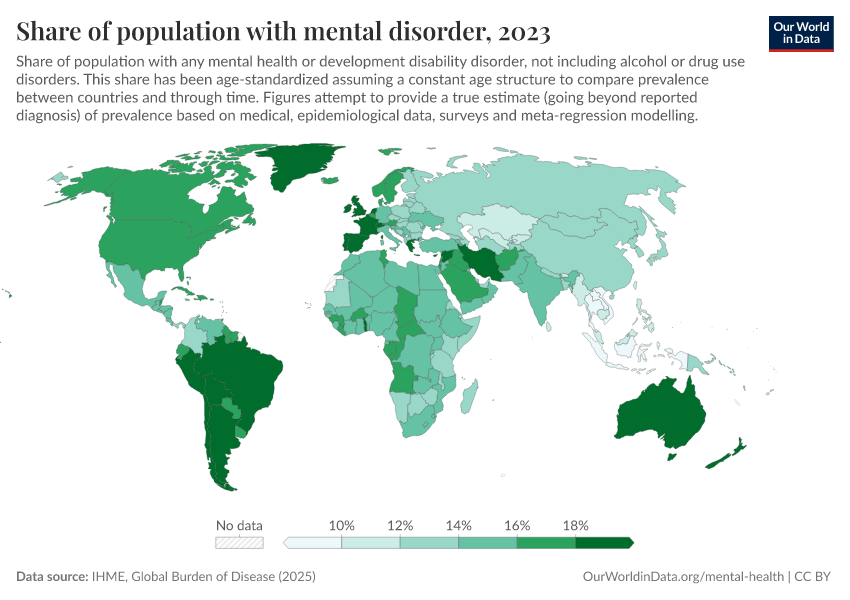 “Data Page: Share of population with mental disorder”, part of the following publication: Saloni Dattani, Lucas Rodés-Guirao, Hannah Ritchie, and Max Roser (2023) - “Mental Health”. Data adapted from IHME, Global Burden of Disease. Retrieved from https://style-labor-employmentrate-c.owid.pages.dev:8789/20260212-100858/grapher/share-with-mental-health-or-development-disorder.html [online resource] (archived on February 12, 2026).How to cite this data