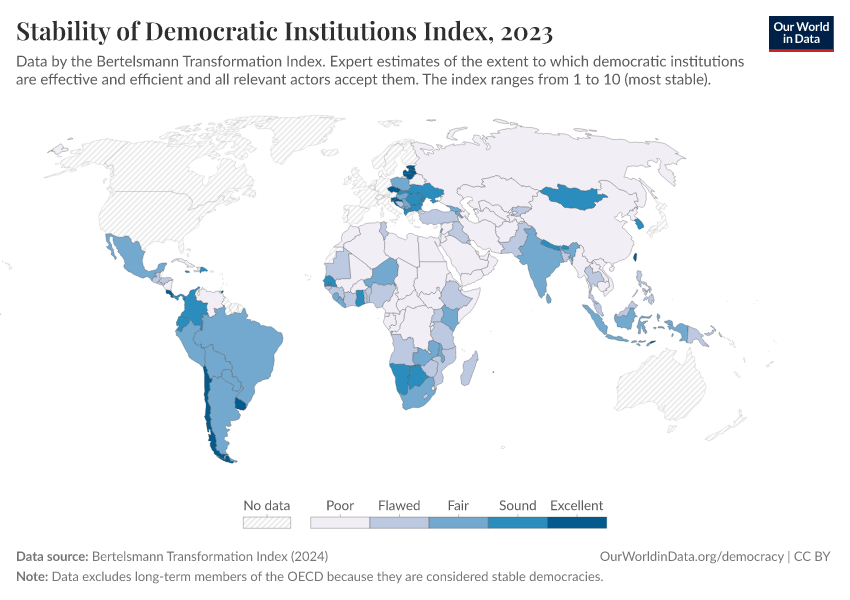 Bertelsmann Transformation Index (2024) – processed by Our World in Data. “Stability of Democratic Institutions Index” [dataset]. Bertelsmann Transformation Index, “Bertelsmann Transformation Index, Scores” [original data]. Retrieved February 25, 2026 from https://style-labor-employmentrate-c.owid.pages.dev:8789/20260105-133053/grapher/stability-democratic-institutions-index-bti.html (archived on January 5, 2026).