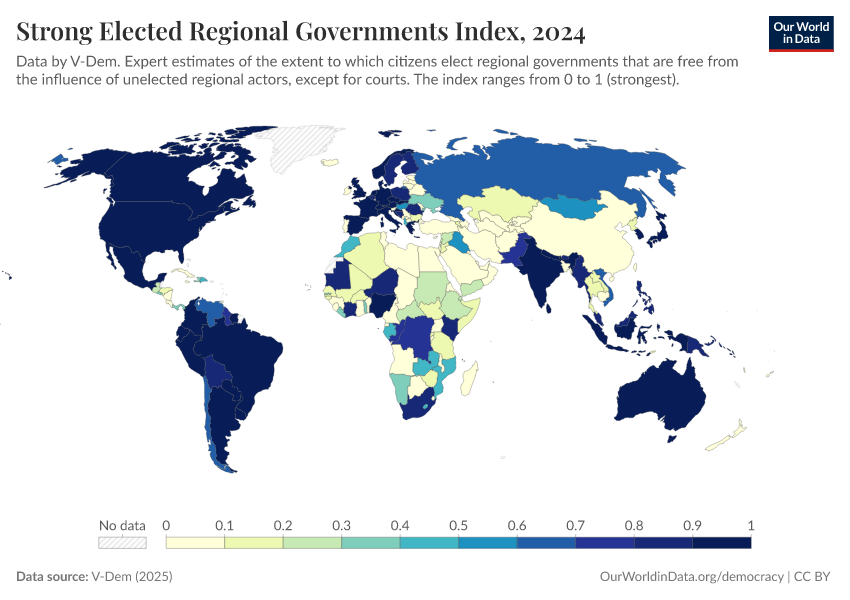 “Data Page: Elected regional governments”, part of the following publication: Bastian Herre, Lucas Rodés-Guirao, and Esteban Ortiz-Ospina (2013) - “Democracy”. Data adapted from V-Dem. Retrieved from https://style-labor-employmentrate-c.owid.pages.dev:8789/20260119-070102/grapher/strong-elected-regional-governments-index.html [online resource] (archived on January 19, 2026).How to cite this data