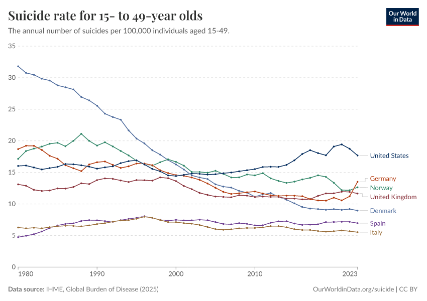 “Data Page: Suicide rate for 15- to 49-year olds”, part of the following publication: Esteban Ortiz-Ospina and Max Roser (2016) - “Global Health”. Data adapted from IHME, Global Burden of Disease. Retrieved from https://style-labor-employmentrate-c.owid.pages.dev:8789/20260211-174736/grapher/suicide-rate-for-15--to-49-year-olds.html [online resource] (archived on February 11, 2026).How to cite this data
