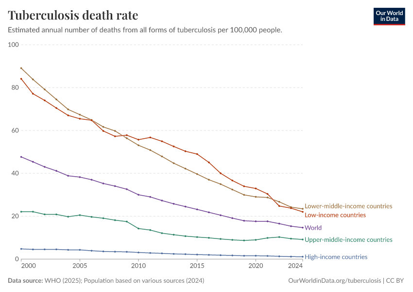 “Data Page: Tuberculosis death rate”, part of the following publication: Saloni Dattani, Fiona Spooner, Hannah Ritchie, and Max Roser (2023) - “Tuberculosis”. Data adapted from WHO, Various sources. Retrieved from https://style-labor-employmentrate-c.owid.pages.dev:8789/20260205-170810/grapher/tuberculosis-death-rate.html [online resource] (archived on February 5, 2026).How to cite this data