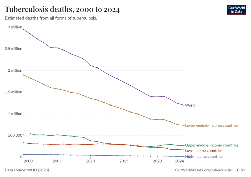 WHO (2025) – with minor processing by Our World in Data. “Tuberculosis deaths” [dataset]. WHO, “Global Tuberculosis Report - Burden Estimates” [original data]. Retrieved February 25, 2026 from https://style-labor-employmentrate-c.owid.pages.dev:8789/20260205-170810/grapher/tuberculosis-deaths-who.html (archived on February 5, 2026).