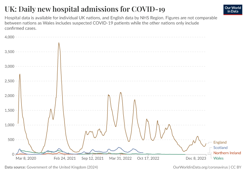 Government of the United Kingdom (2024) – with minor processing by Our World in Data. “UK: Daily new hospital admissions for COVID-19” [dataset]. Government of the United Kingdom, “UKHSA data dashboard” [original data]. Retrieved February 25, 2026 from https://style-labor-employmentrate-c.owid.pages.dev:8789/20250909-093708/grapher/uk-daily-covid-admissions.html (archived on September 9, 2025).