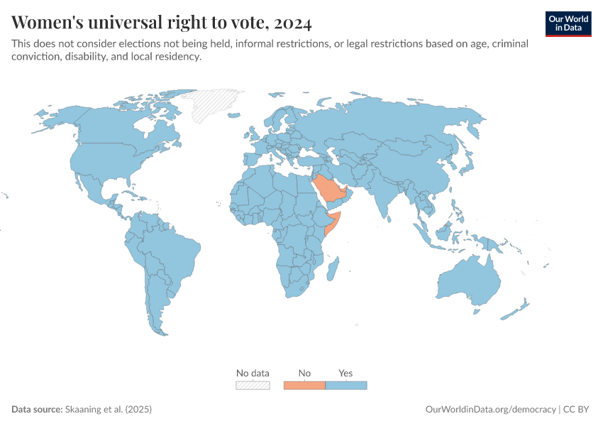 Skaaning et al. (2025) – processed by Our World in Data. “Women's universal right to vote” [dataset]. Skaaning et al., “Lexical Index of Electoral Democracy (LIED) v6.8” [original data]. Retrieved February 25, 2026 from https://style-labor-employmentrate-c.owid.pages.dev:8789/20260119-065148/grapher/universal-suffrage-women-lexical.html (archived on January 19, 2026).