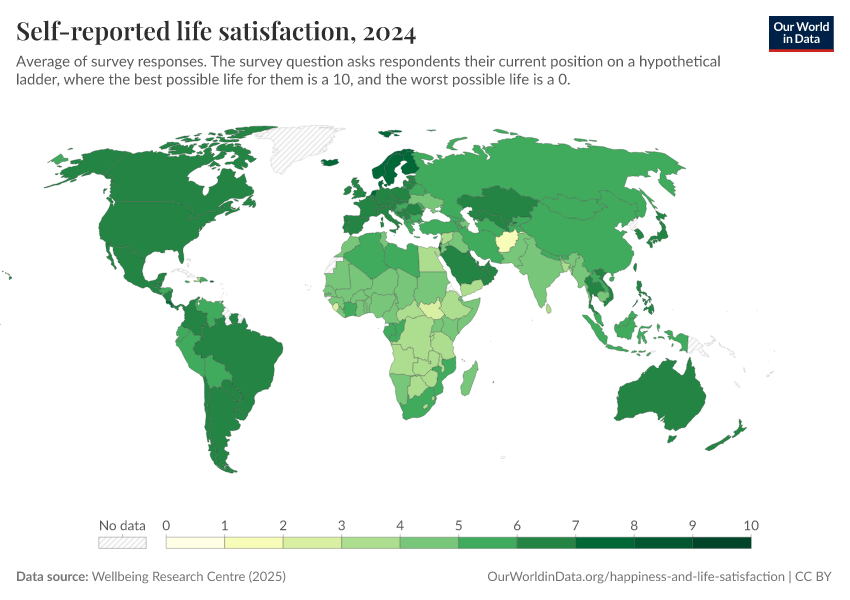 Self-reported life satisfaction tends to correlate with other measures of well-being—richer and healthier countries tend to have higher average happiness scores. (More on this in the section below.)