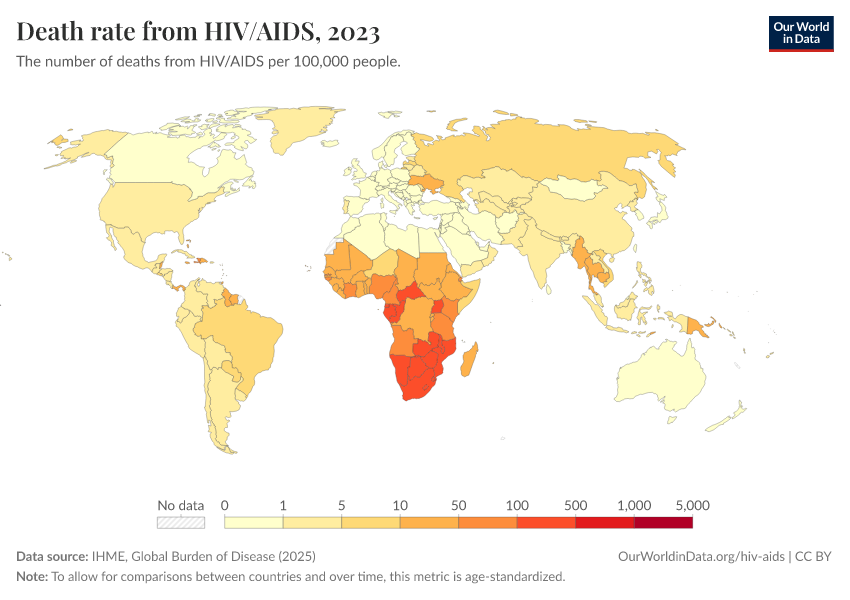 The significant health burden of HIV/AIDS across Sub-Saharan Africa is also reflected in death rates. Death rates measure the number of deaths from HIV/AIDS per 100,000 individuals in a country or region.