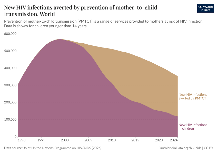 The map shows the total number of children newly infected with HIV yearly. Globally — with similar trends at national levels — the number of new infections in children peaked around the early 2000s (with over 500,000 new infections per year globally), followed by a rapid decline over the last decade.